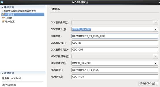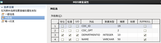 通过工具栏的“数据读取“中的“增量表”选择的数据集,就可以在普通表上添加增量表。比如下图,是在普通表DEPARTMENT_T1上添加的MD5_CDC表。