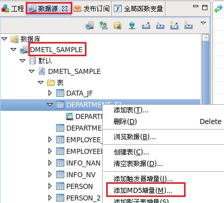 在数据集DMETL_SAMPLE 库下添加表DEPARTMENT_T1、DEPARTMENT_T2(图2),在表DEPARTMENT_T1 处添加MD5 增量表(图3~5):